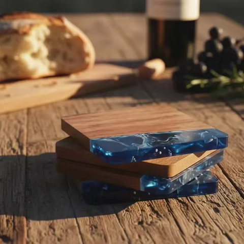 แผ่นรองแก้วไม้อะคาเซียทนความร้อนสำหรับกาแฟแผ่นรองแก้วไม้เรซินทรงสี่เหลี่ยมออกแบบโลโก้ได้ตามต้องการ