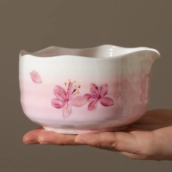 Hand Painted Ceramic Matcha Bowl Pink Ice Flower Crystalline Glaze with Spout Bowl for Coffee & Tea Sets