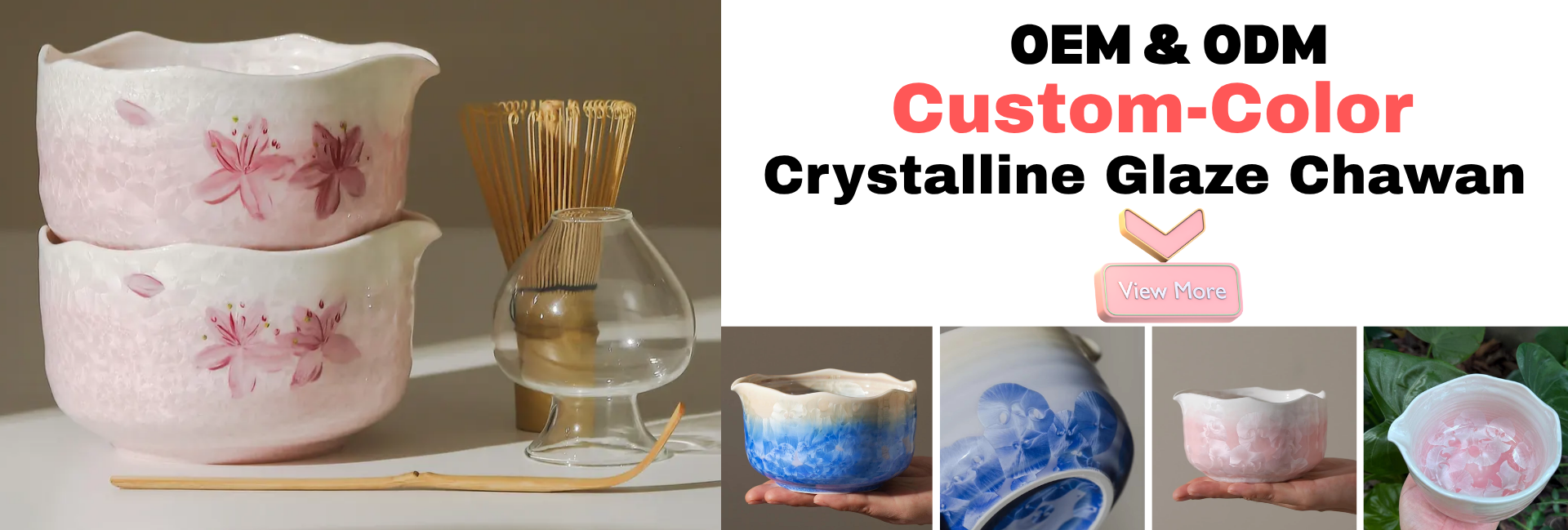 Ciotola in ceramica Matcha dipinta a mano con glassa cristallina di fiori di ghiaccio rosa con beccuccio per caffè e set da tè