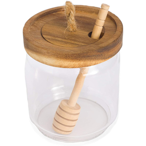 Ev ve mutfak için taşınabilir 14oz ahşap kepçe akasya kapak cam konteyner depolama bal kavanozu