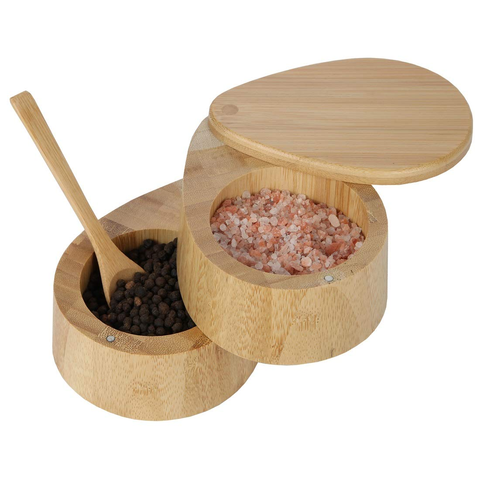 Bambu 2 katmanlı ahşap tuz ve biber baharat kutu seti ile eşleşen kaşık manyetik kapak baharat depolama için ot koleksiyonu için