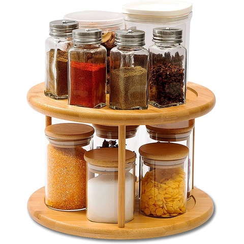 Atacado Cozinha Desktop Multifuncional Spice Jars Organizer 4 Tiers 16 Latas De Bambu Rotating Spice Rack De Armazenamento